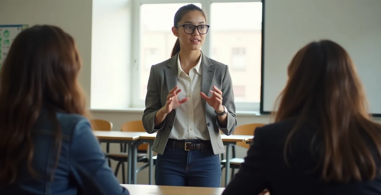 L’erreur la plus courante est une posture « fermée » qui trahit le stress : les épaules rentrées, le regard fuyant, les mains qui triturent un stylo ou se cachent dans les poches. Cette posture envoie un signal de repli et de manque d’assurance. Le jury, inconsciemment, perçoit un candidat qui subit l’épreuve plutôt qu’il ne la maîtrise. Pour contrer cela, la clé est l’ancrage physique. Tenez-vous droit, les pieds bien à plat sur le sol, les épaules légèrement en arrière. Cette simple posture « ouverte » ne change pas seulement la perception du jury ; elle envoie aussi un signal à votre propre cerveau, diminuant le sentiment de stress.